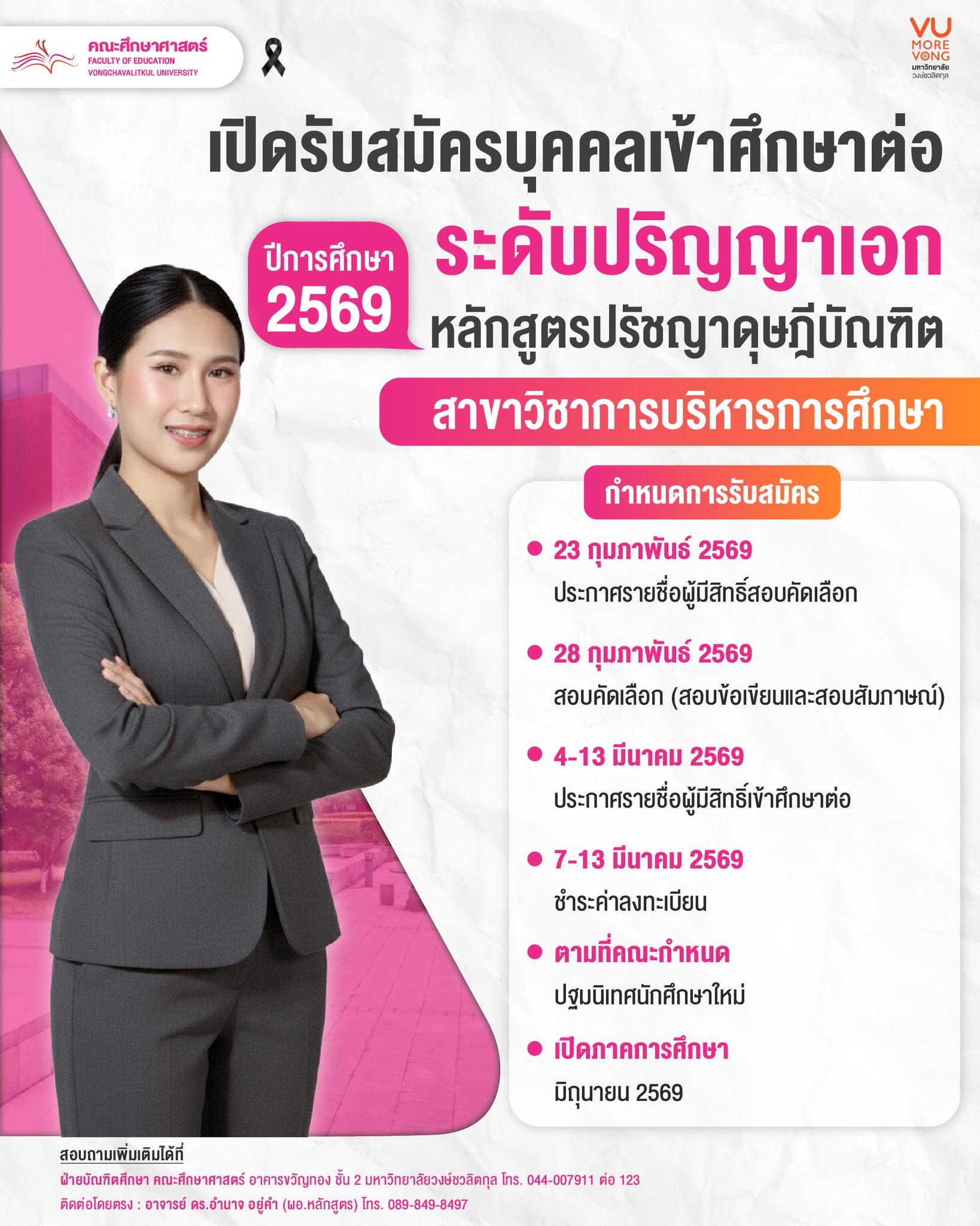 👩🏫 คณะศึกษาศาสตร์ มหาวิทยาลัยวงษ์ชวลิตกุล เปิดรับสมัครบุคคลเข้าศึกษาต่อ ระดับปริญญาเอก ปีการศึกษา 2569 หลักสูตรปรัชญาดุษฎีบัณฑิต สาขาวิชาการบริหารการศึกษา