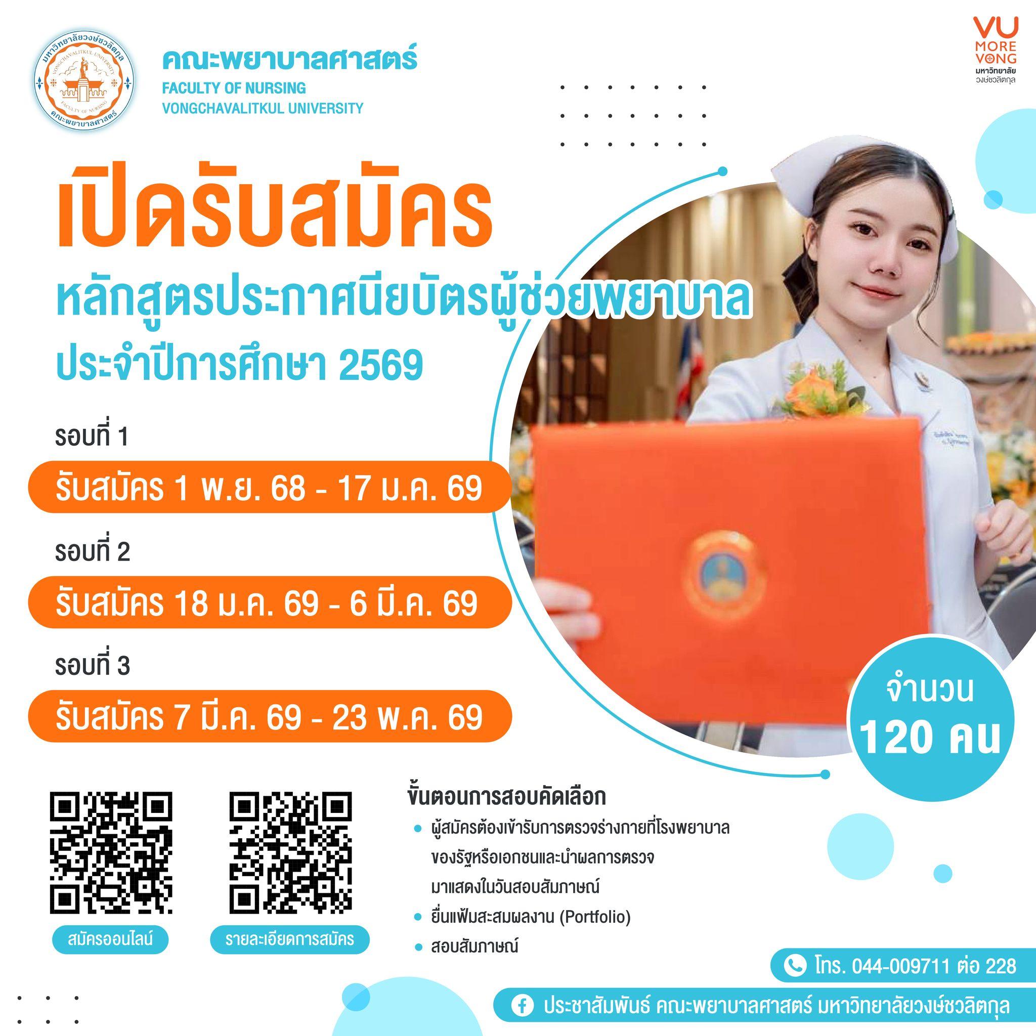 🎓 คณะพยาบาลศาสตร์ มหาวิทยาลัยวงษ์ชวลิตกุล เปิดรับสมัครหลักสูตรประกาศนียบัตรผู้ช่วยพยาบาล รอบที่ 1 ประจำปีการศึกษา 2569