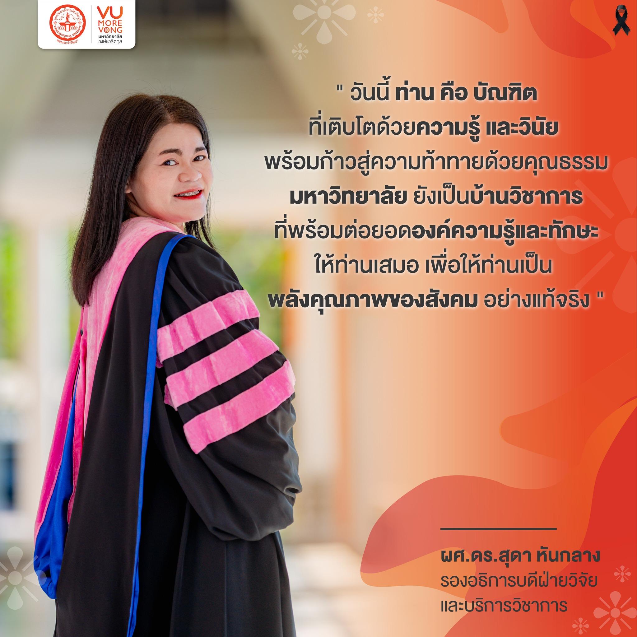 🎓 “วันนี้ท่าน คือ บัณฑิตที่เติบโตด้วยความรู้และวินัย พร้อมก้าวสู่ความท้าทายด้วยคุณธรรม มหาวิทยาลัยยังเป็นบ้านวิชาการที่พร้อมต่อยอดองค์ความรู้และทักษะให้ท่านเสมอ เพื่อให้ท่านเป็น ‘พลังคุณภาพของสังคม’ อย่างแท้จริง” 💖🥰