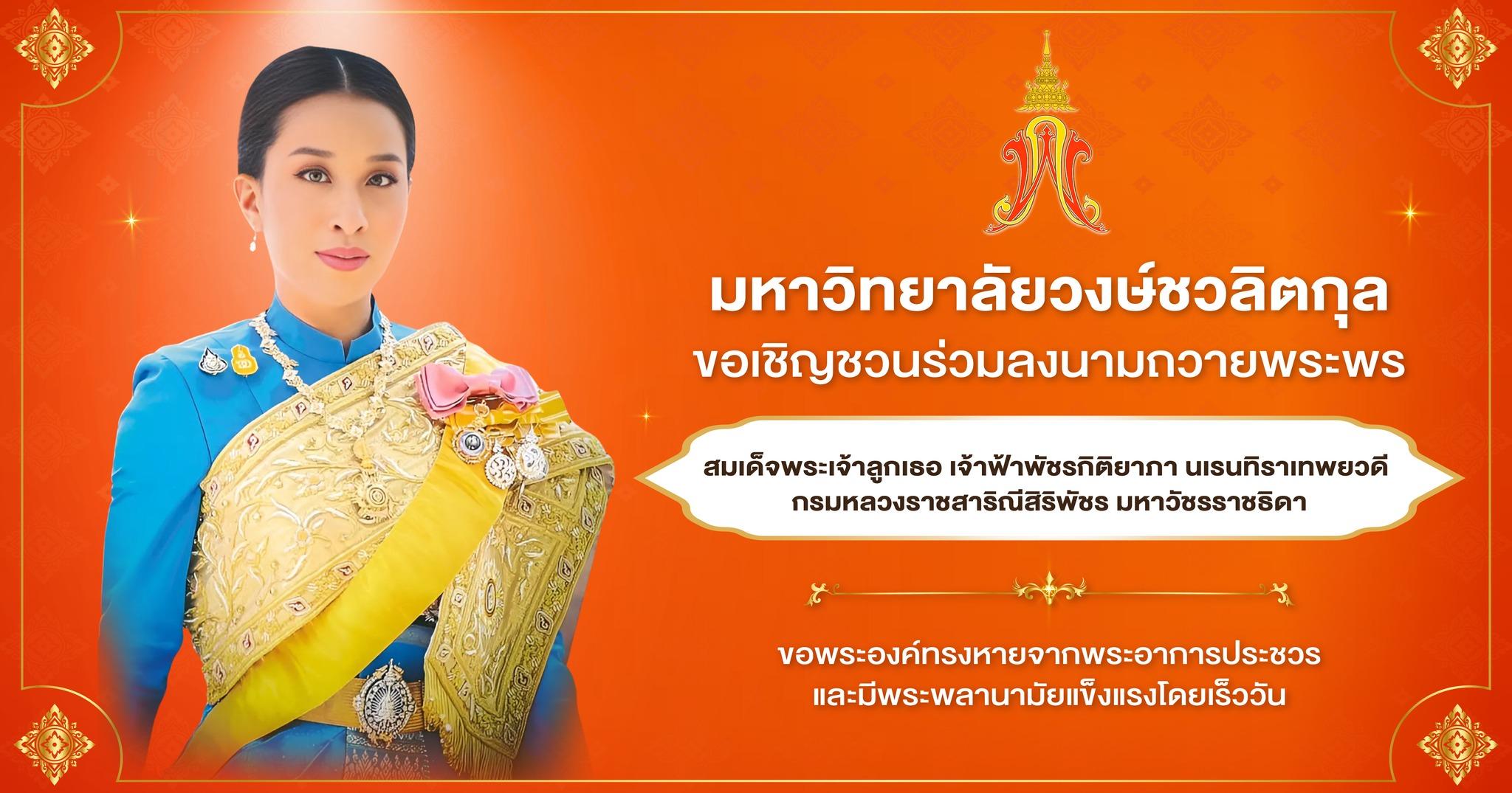 🟠 มหาวิทยาลัยวงษ์ชวลิตกุล ขอเชิญชวนร่วมลงนามถวายพระพร สมเด็จพระเจ้าลูกเธอ เจ้าฟ้าพัชรกิติยาภา นเรนทิราเทพยวดี กรมหลวงราชสาริณีสิริพัชร มหาวัชรราชธิดา
