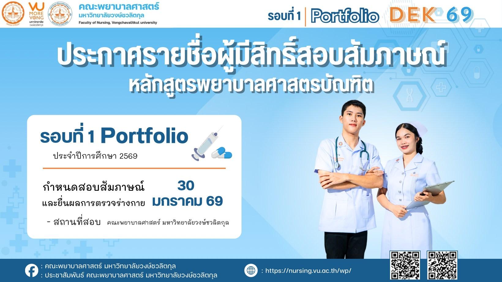 รายชื่อผู้มีสิทธิ์เข้าสอบสัมภาษณ์ รอบ 1 คัดเลือกโดยการรับตรงยื่นแฟ้มสะสมผลงาน (Portfolio) หลักสูตรพยาบาลศาสตรบัณฑิต ประจำปีการศึกษา 2569