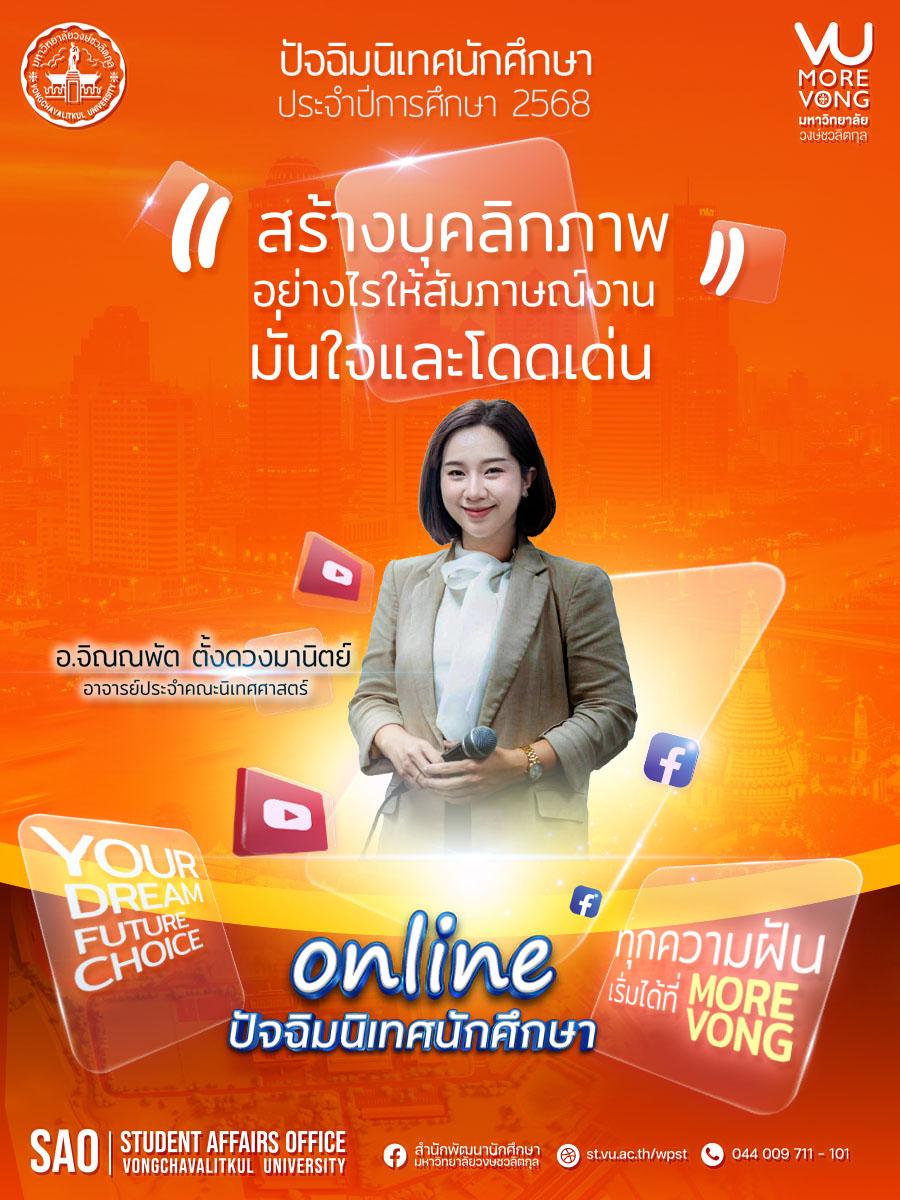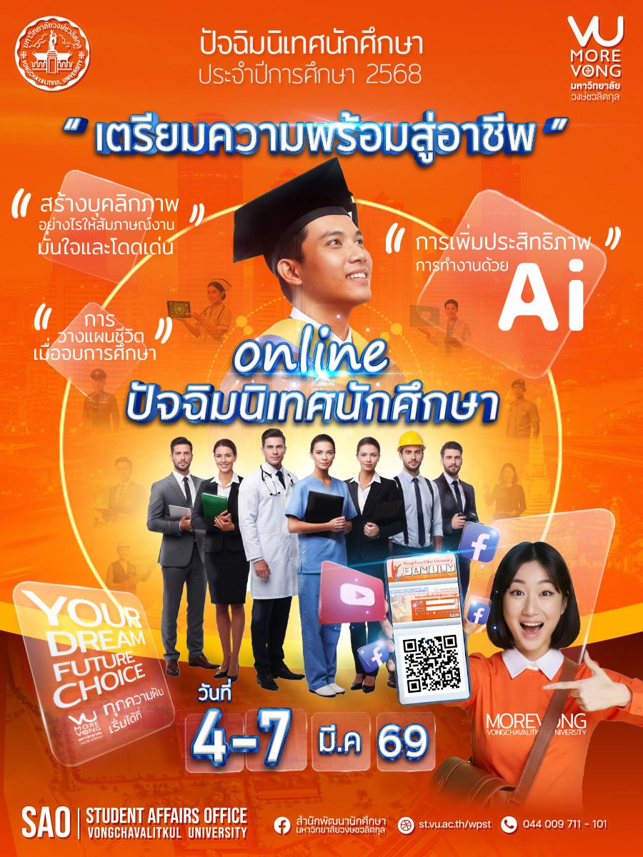 ประชาสัมพันธ์ นักศึกษาชั้นปีที่ 3 และปีที่ 4 โดยที่นักศึกษาสามารถรับชมผ่านระบบสารสนเทศนักศึกษา VU Family มหาวิทยาลัยวงษ์ชวลิตกุลได้ตลอด 24 ชั่วโมง ซึ่งปีนี้ภายใต้หัวข้อ " เตรียมความพร้อมสู่มืออาชีพ "ก้าวสู่การทำงานเเบบเต็มตัว และการใช้ชีวิตในโลกแห่งความจริง!
