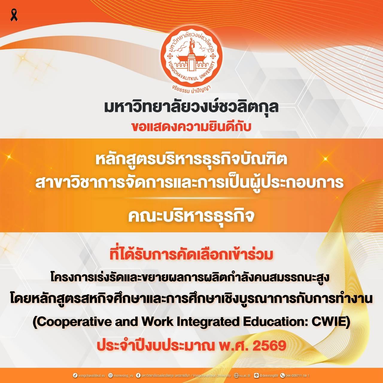 💖 ขอแสดงความยินดีกับ “หลักสูตรบริหารธุรกิจบัณฑิต สาขาวิชาการจัดการและการเป็นผู้ประกอบการ” คณะบริหารธุรกิจ ที่ได้รับคัดเลือกเข้าร่วมโครงการ CWIE ประจำปีงบประมาณ 2569 ✨